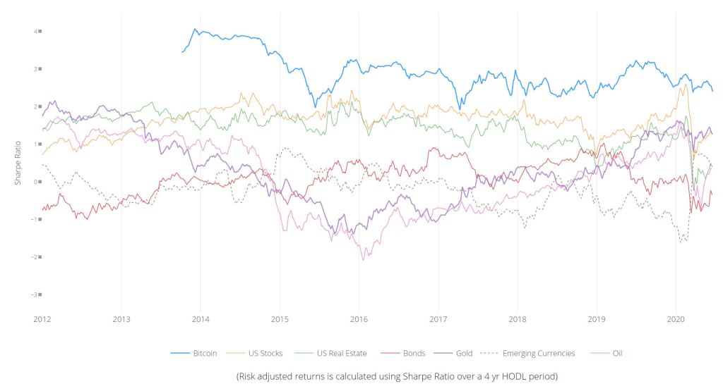Ora segundo esta métrica o Bitcoin, é o melhor ativo que alguém pode juntar à sua carteira, como se pode ver no gráfico abaixo (retirado daqui). A linha azul mostra o rácio do Bitcoin. As outras linhas são ativos como ações americanas, ouro ou o mercado imobiliário americano. A ideia prevalente é que o Bitcoin é um ativo arriscado. No entanto, com esta ferramenta, utilizada de forma geral nos mercados financeiros, concluímos que o risco inerente ao Bitcoin é recompensado de forma superior a qualquer outra classe de ativos.