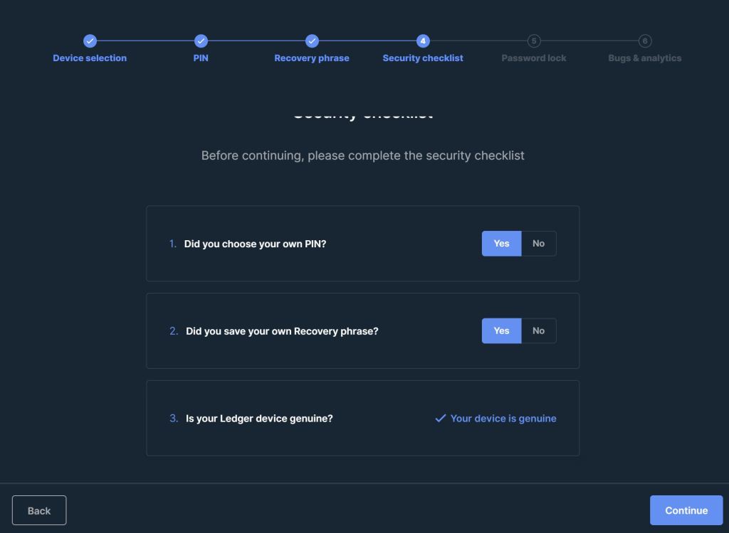 Todo este processo será acompanhado na aplicação Ledger Live no teu computador que fará uma verificação interna para confirmar que o aparelho é genuíno. No final pedir-te-á que definas uma password para acederes à aplicação.