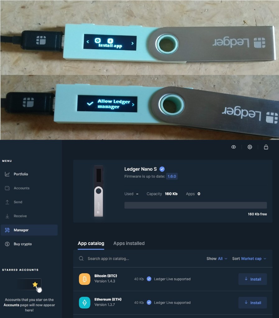 Para instalar a aplicação que te permite guardar bitcoins na tua carteira, deves selecionar a opção “Install app” na Nano S e dar o controlo do aparelho ao Ledger Live. A partir daqui podes escolher a aplicação Bitcoin e instalá-la.