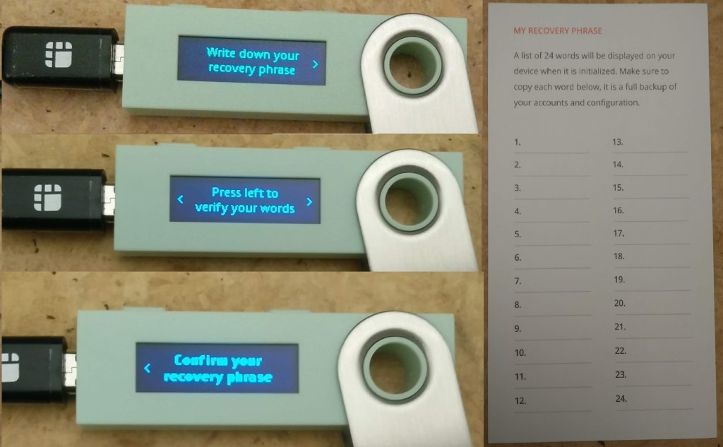 Depois, chega a parte mais importante a nível de segurança e recuperação. O aparelho irá mostrar-te a lista de 24 palavras que constituem a semente-mestre desta nova carteira. Repito que esta semente-mestre é a única coisa que te permite recuperar os fundos guardados na carteira no caso de perderes a Nano S ou ela se avariar. A Ledger não terá nenhuma cópia destas palavras e ninguém te poderá ajudar se as perderes. O dinheiro que guardares dentro desta carteira estará perdido para sempre. Utiliza as folhas fornecidas na embalagem ou algum recurso de papel com que te sintas mais confortável: um caderno ou papel onde tenhas as tuas passwords e códigos. O aparelho vai mostrar as palavras 2 vezes e pedir-te para as introduzires e confirmares de seguida.