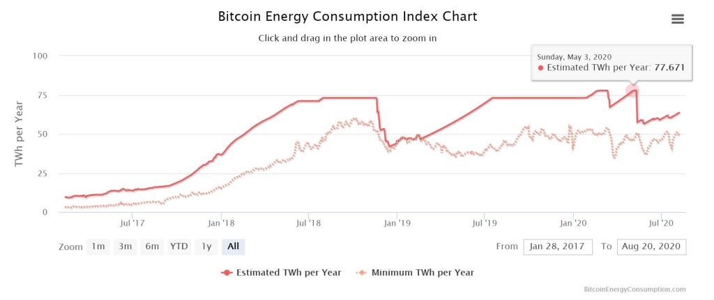 No Prova-de-Trabalho, os mineradores têm que competir para conseguir descobrir a solução ao problema criptográfico proposto. Esta competição exige um grande poder de computação atríbuido à rede pelos mineradores na esperança de conquistarem a recompensa na forma das moedas devidas. Actualmente, estima-se que a rede Bitcoin gaste cerca de 77TWh de energia por ano. Mais energia que aquela que é consumida pela Suíça inteira!