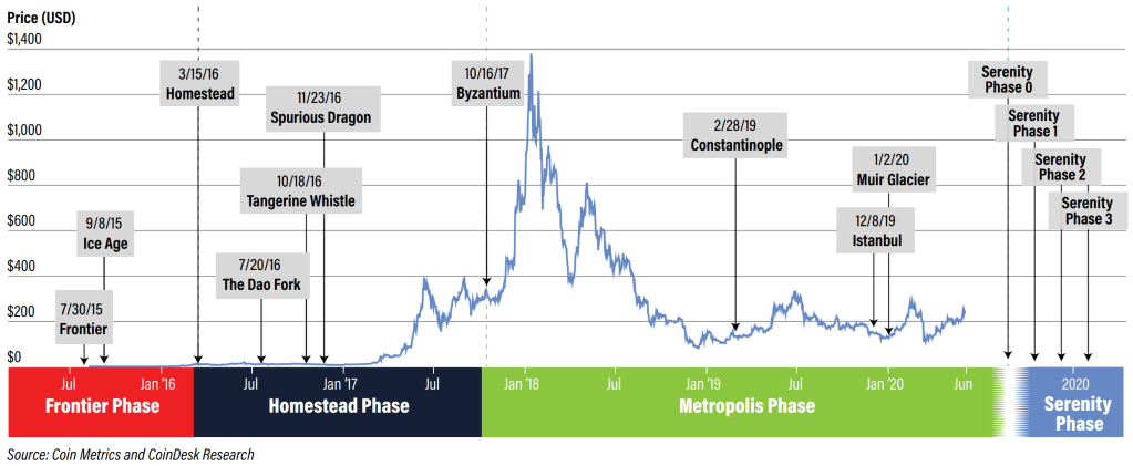 As primeiras 3 fases chamaram-se Frontier, Homestead e Metropolis e cada uma delas deu um passo importante para aumentar a capacidade da rede. A fase Serenity é o passo final e estará, também ela, dividida em 4 fases. Desta forma a transição far-se-á da forma mais tranquila possível. Apesar dessa intenção, o próprio lançamento desta fase tem sido atribulado e já foi adiado algumas vezes. Este novo passo será o mais complexo pois exige duas novidades que nunca foram testadas: